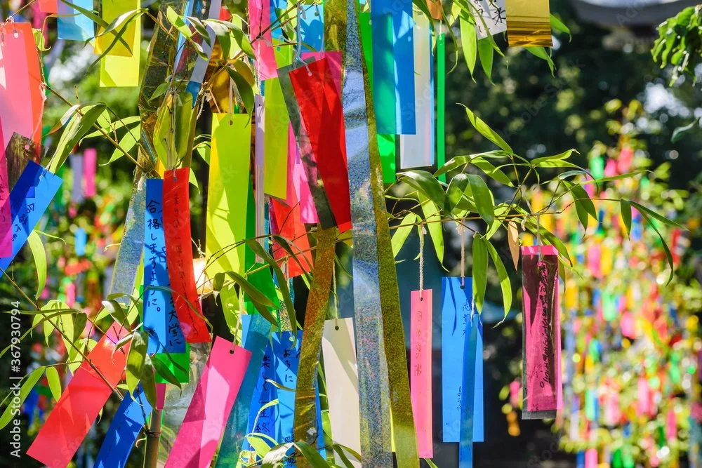 In Japan, for Tanabata, people bring home bamboo trees and hang small pieces of paper called tanzaku on the bamboo leaves, writing their wishes on them. They also decorate the bamboo with paper ornaments and other decorations.